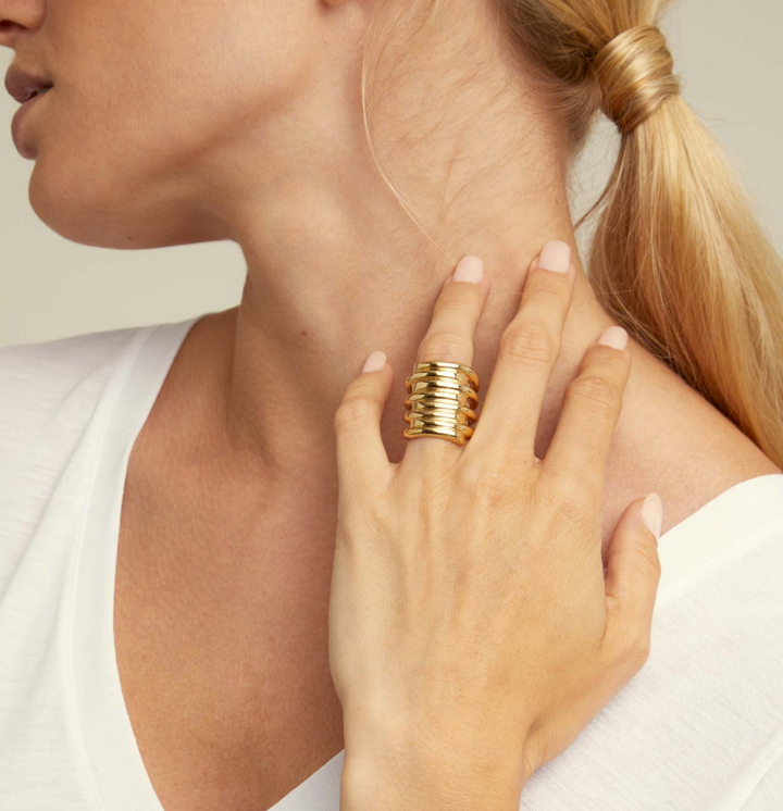 The design of this jewel creates an effect of stacked rings, with an irregular finish due to its craftsmanship. Made in Spain, with a 18K gold-plated metal alloy. Get this original piece and wear it in your daily life to add a unique touch to your looks.