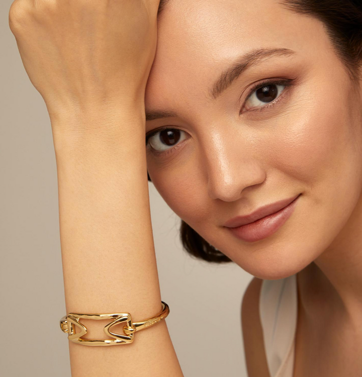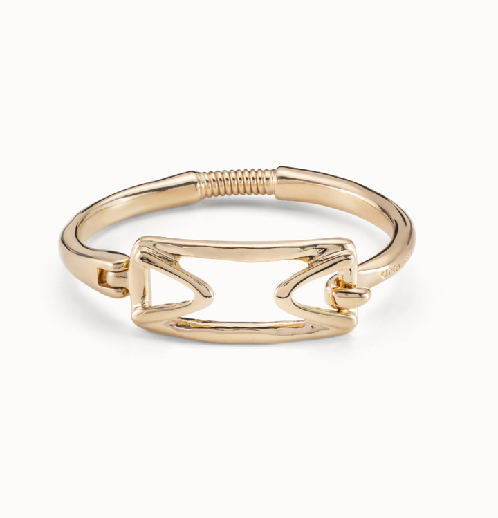 Pieces of organic geometry add courage and give life to the Brave collection with this rigid bracelet with a spring and a large rectangular link.