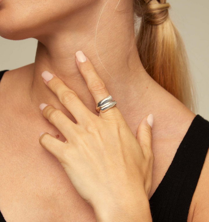The Crossed Legs ring is a tube-shaped piece that meets at the center. From metal alloy casting to silver plating, this ring is handcrafted in Spain using artisan techniques. Wear this unique ring with other pieces from the collection!