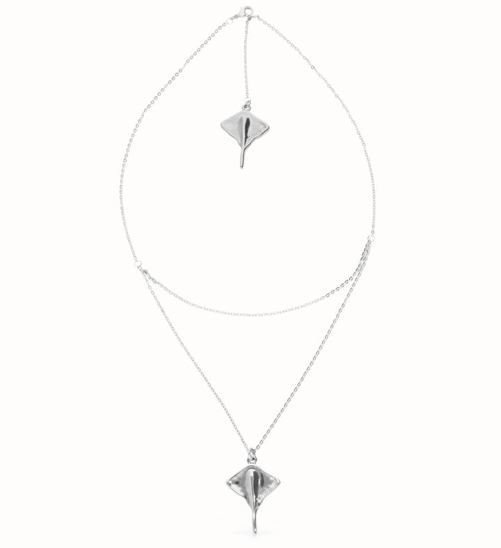 Double short chain pendant with stingray and a stingray that hangs at the back of the necklace. Get the pieces of the collection Ser Majestuosa, a tribute to Puerto Rico island and it’s people due the elegance of the manta ray flapping through the sea.