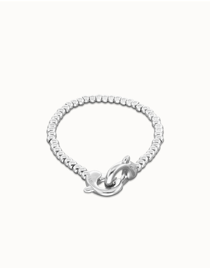 Small beads bracelet with silver plated carabiner clasp. A subtle piece of jewellery that concentrates the strength of your links. This petite bead bracelet features a polished sphere design that brings understated, elegant sparkle. It is complemented by the distinctive interlocking carabiner clasp, all in sterling silver for a luminous and durable finish.