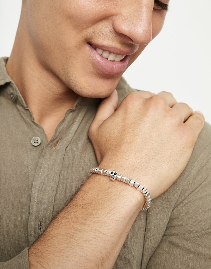 Bracelet with silver metal alloy beads and skull. Jewellery, skulls, and rock & roll. The collection Ser imparable is designed to bring out your most punk spirit; a spirit that prefers to ask for forgiveness rather than permission, a spirit that is unstoppable and gives it all. If you are surrounded by chaos and noise with the volume up to the max, Ser Imparable is the collection that will take you on stage like a true rock star.