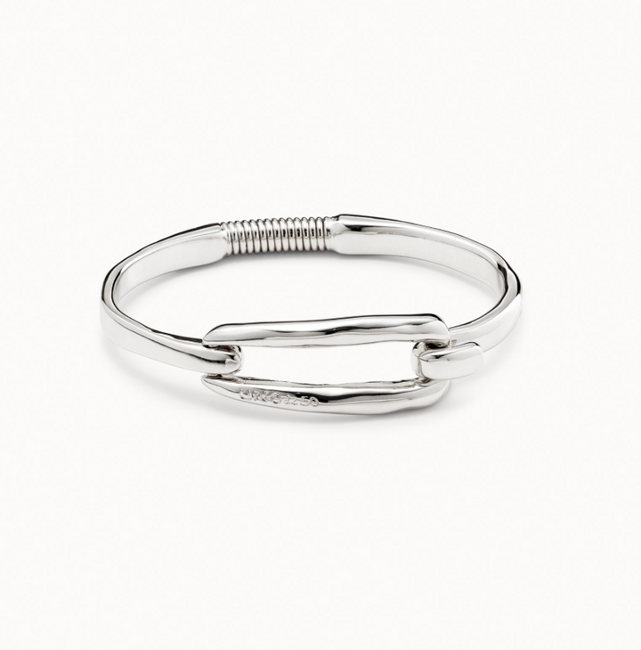 Rigid silver plated bracelet with an original rectangular buckle clasp in the middle and UNOde50 brand name engraved. A bracelet created by UNOde50!