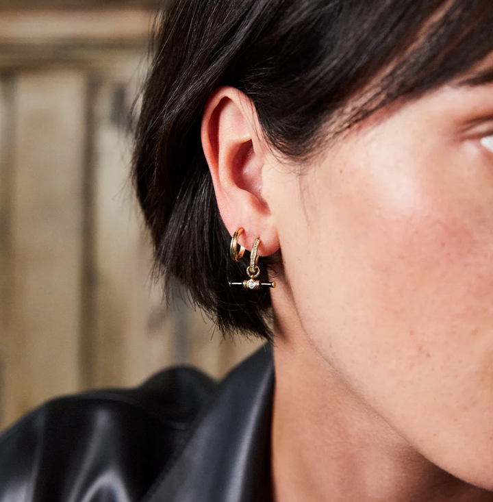 A love letter to our most coveted pieces and featuring the most delicate of stonework and hand-painted black enamel, the Dyllan T-bar hoops are a homage to our Marlowe collection. Suspended from an 18ct Gold Vermeil hoop set with round cut white topaz stones. These earrings feature a detachable T-bar charm and are fitted with a post and butterfly fastening designed for pierced ears.