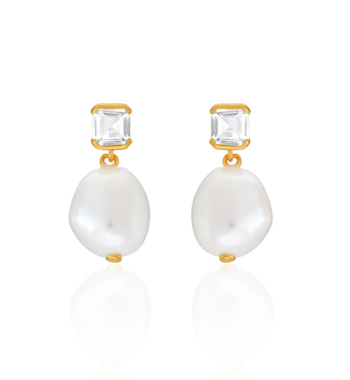 The Bella Pearl Earrings feature baroque pearl and step cut white topaz, a staple in V jewellery and a nod to our Art Deco inspiration. The perfect bridal earrings that re-imagine classic vintage designs through a contemporary lens for the modern bride and can be worn effortlessly on your big day and beyond. Made from 18 carat gold vermeil and set with a step cut white topaz stone and baroque pearl.
