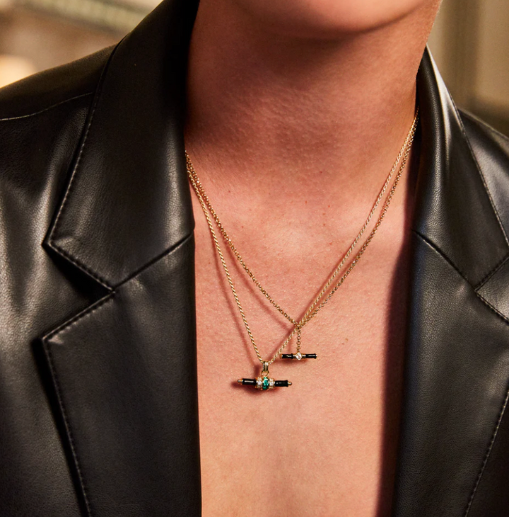 Presented on our staple V rope chain and inspired by our core style which is rooted in 1930s architectural design, the Bridget Necklace is an adaptation of our Marlowe design and the perfect balance of grandeur and utility; featuring a hand painted T-bar with black enamel, set with white topaz and emerald green cubic zirconia stones.