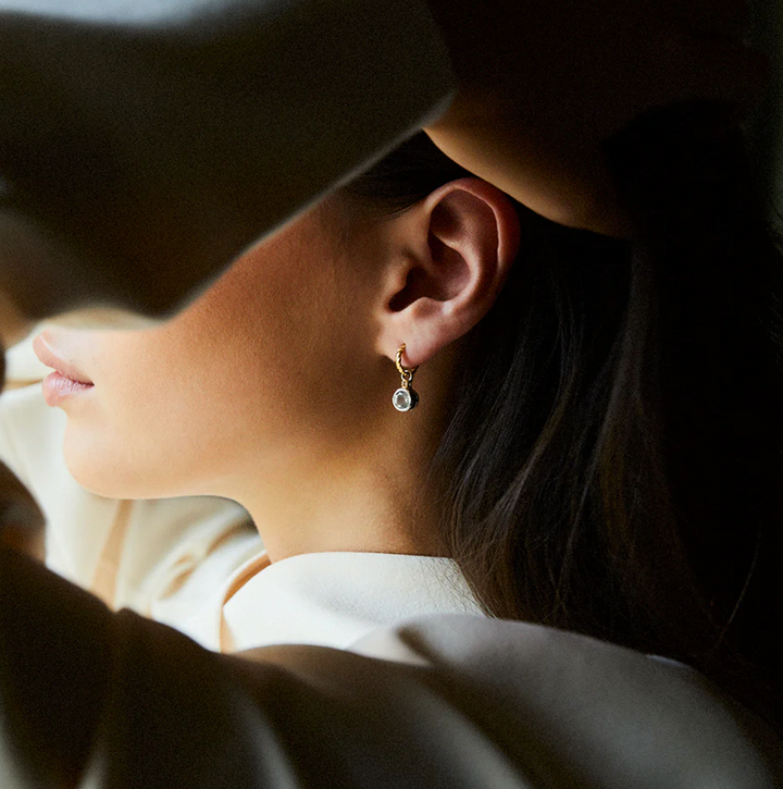 Every round brilliant cut charm is delicately encased within a silver bezel, positioned beneath a round brilliant white topaz set rondelle, and elegantly suspended from intricately twisted hoops. Available as a set, the detachable charm feature of these earrings enhances their versatility, offering a unique two-in-one design. Crafted with precision, our charms and hoops are meticulously fashioned from 18ct Gold Vermeil and recycled 925 Sterling Silver.