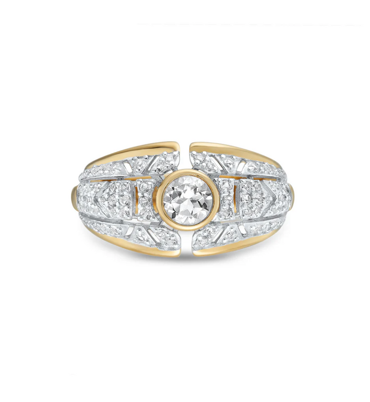 The Chloe Ring, a modern take on a vintage Bombé ring, features exquisite brilliant cut white topaz stones, meticulously set into sterling silver and highlighted by a central gold vermeil bezel setting and edge detailing.