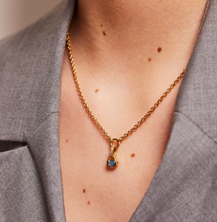 Discover the Natural Stones Collection, a fusion of organic elements and modern deco design. Our Charms and Chains are crafted from 18ct Gold Vermeil and recycled 925 Sterling Silver – each octagon cut natural stone is encased in a bezel setting and comes set on a white topaz clasp which, thanks to it’s discrete push hinge fastening, can be easily fixed to our Carrier Chain. An elevated take on birthstone jewellery – for those with an affinity to Swiss Blue Topaz: