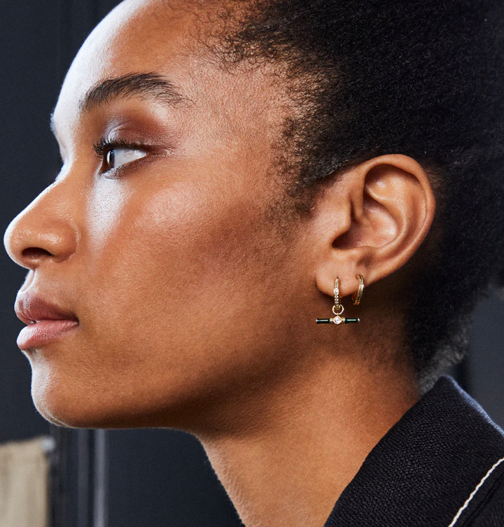 A love letter to our most coveted pieces and featuring the most delicate of stonework and hand-painted black enamel, the Dyllan T-bar hoops are a homage to our Marlowe collection. Suspended from a 18ct Gold Vermeil hoop set with round cut white topaz stones, the black enamel T-bar charm is detachable. These earrings feature a detachable T-bar charm and are fitted with a post and butterfly fastening designed for pierced ears.