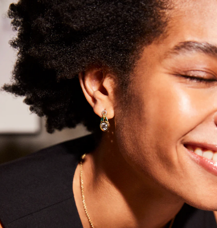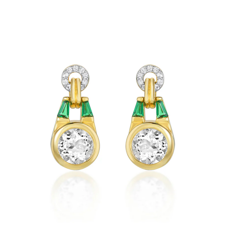 The Olive Earrings take inspiration from V founder and designer Laura Vann’s own engagement ring, featuring a ‘buckle’ design that is now a signature style for the brand and synonymous with V’s bespoke service. Crafted from 18ct yellow gold vermeil and meticulously set with round brilliant white topaz and tapered emerald green cubic zirconia stones.