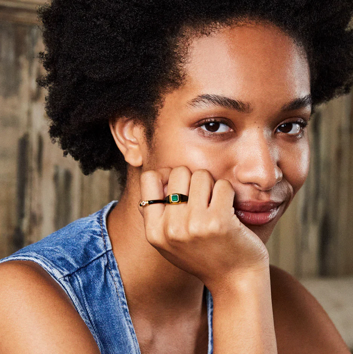 The Gypsy Ring has always been an iconic staple at V, so we decided to give it a modern update with a wash of tonal hand painted enamel. The Sophie Enamel Signet Ring features hand painted black enamel and is set with an emerald green cubic zirconia central stone.
